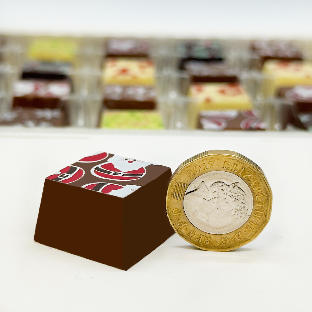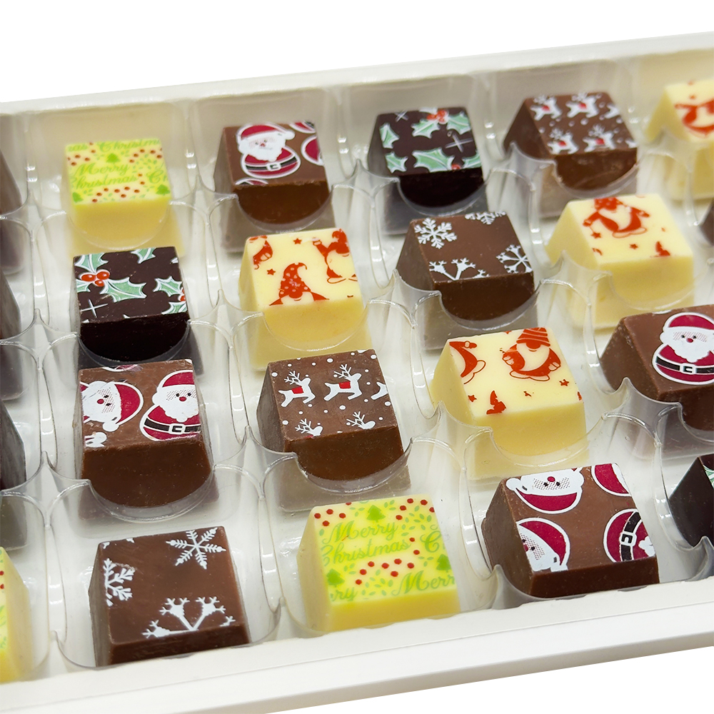 Contains 24 solid chocolate squares in milk, dark, or white chocolate, with every piece featuring a unique Christmas pattern.