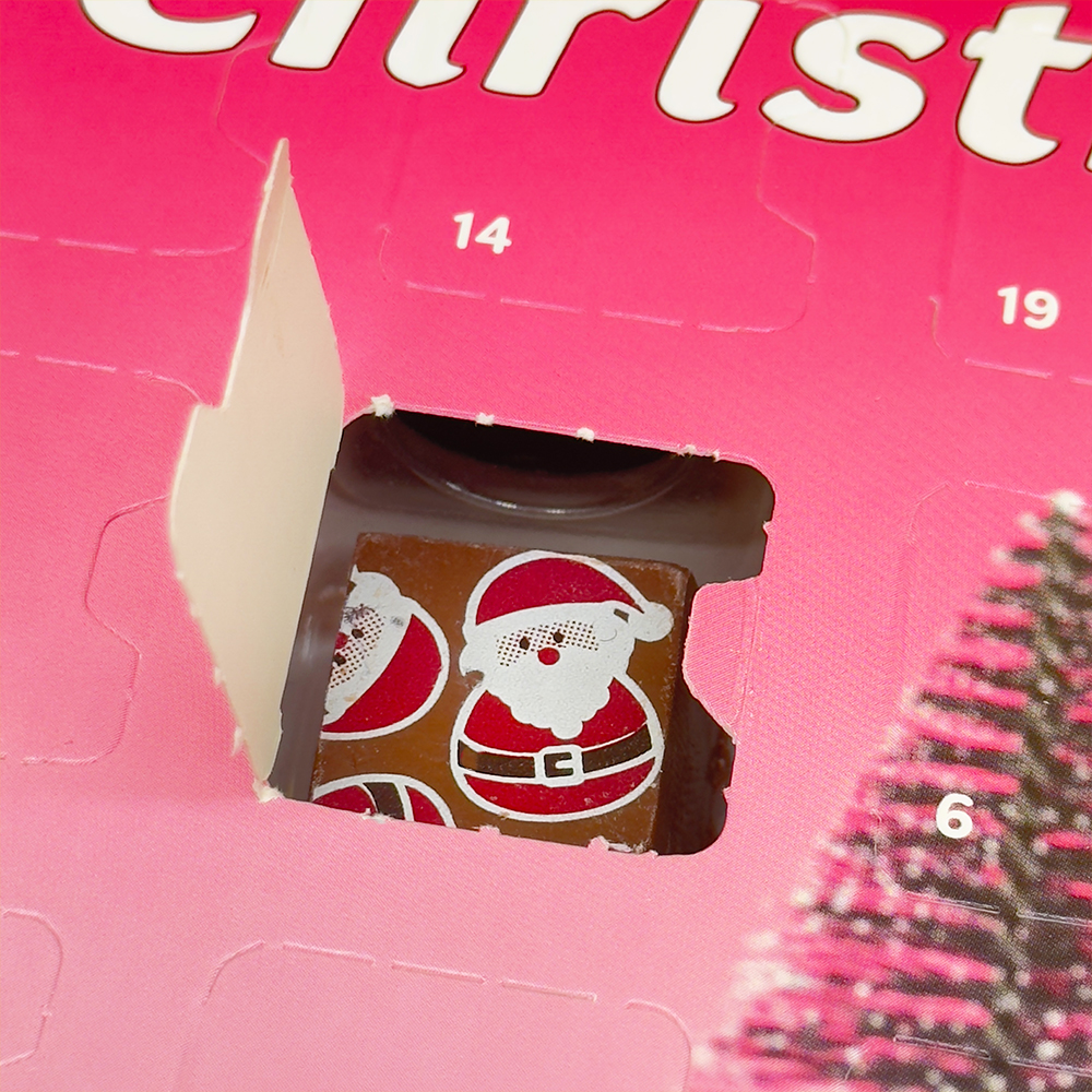 Our Advent Calendar contains 24 solid chocolate squares in milk, dark, or white chocolate, with every piece featuring a unique Christmas pattern.