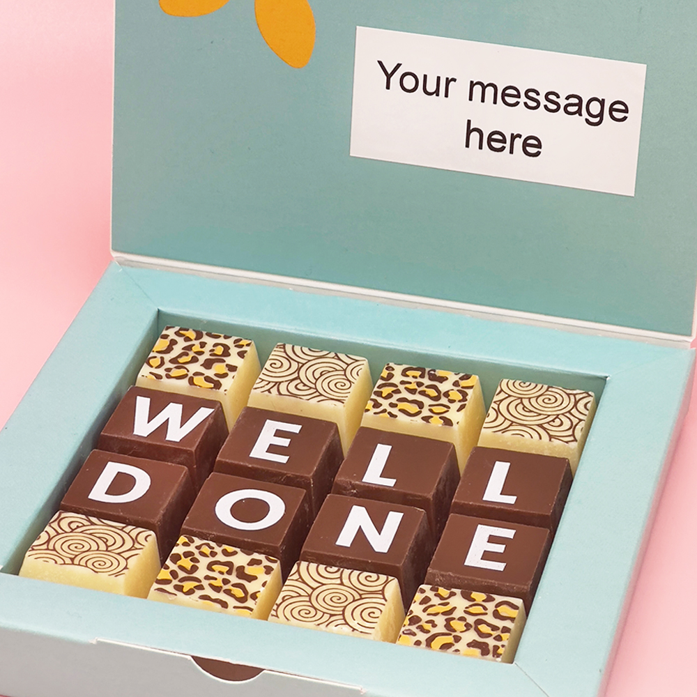 This Good Luck Chocolate Gift is a great way to wish someone good luck. Perfect for friends & family. Solid blocks of delicious Belgian chocolate with Cocoapod Chocolates.