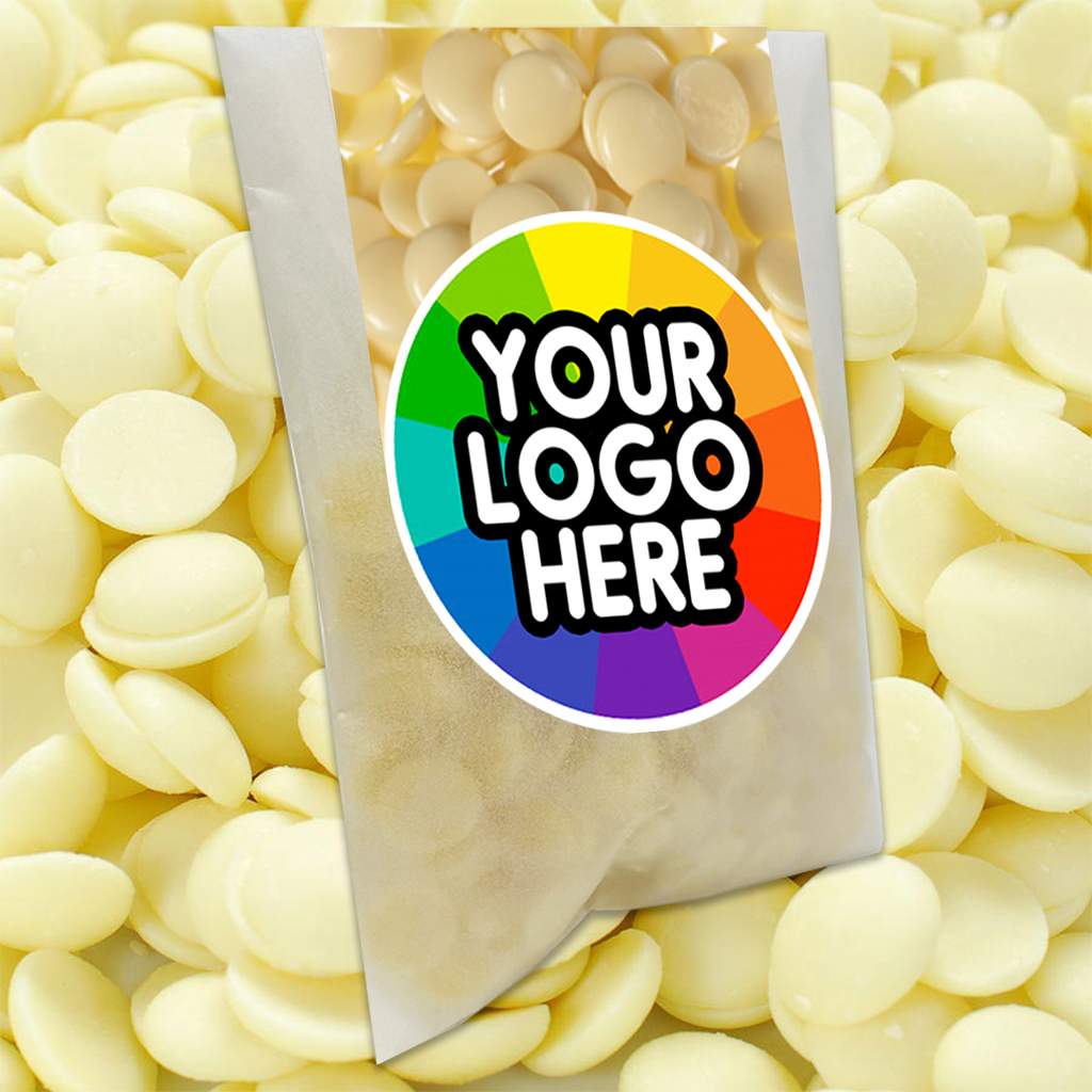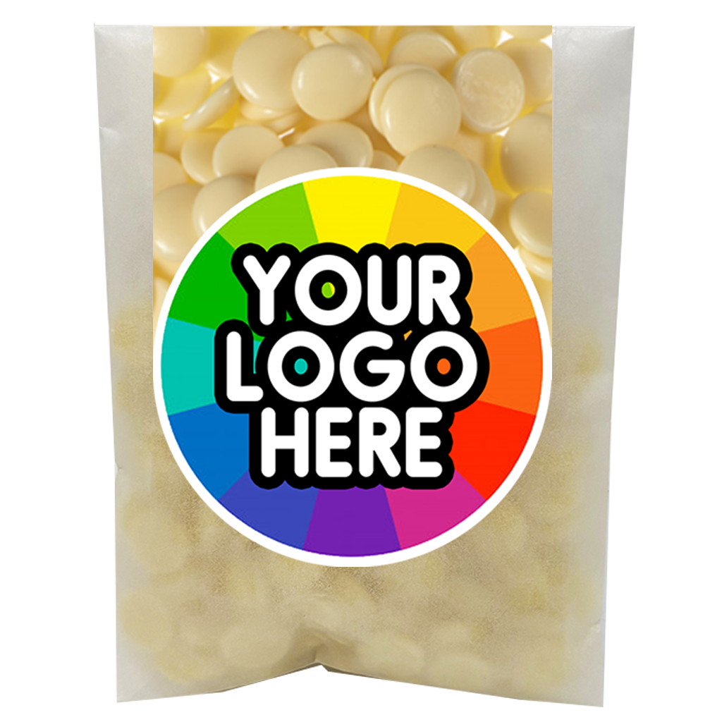 White Chocolate Buttons, packaged within a sticker-branded bag